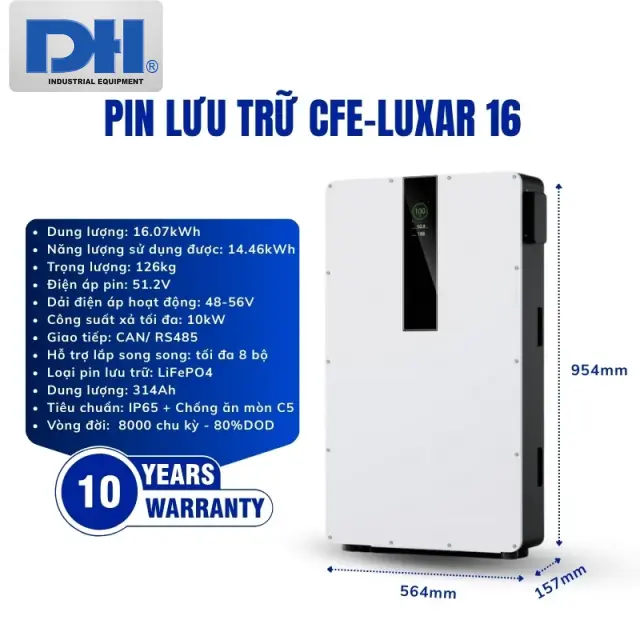 CFE Battery 16.07kWh được thiết kế với dung lượng khả dụng đạt 14.46 kWh, đáp ứng tốt nhu cầu lưu trữ điện cho các hộ gia đình, doanh nghiệp quy mô vừa và nhỏ. Sản phẩm sử dụng công nghệ pin Lithium Iron Phosphate (LiFePO₄) với dung lượng cell 314Ah, nổi tiếng về độ an toàn và tuổi thọ cao đến 8000 chu kỳ sạc/xả. Hiện nay, pin lưu trữ điện mặt trời CFE-LUXAR 16 được Solar DH phân phối chính hãng tại Việt Nam, bảo hành chính hãng đến 10 năm.