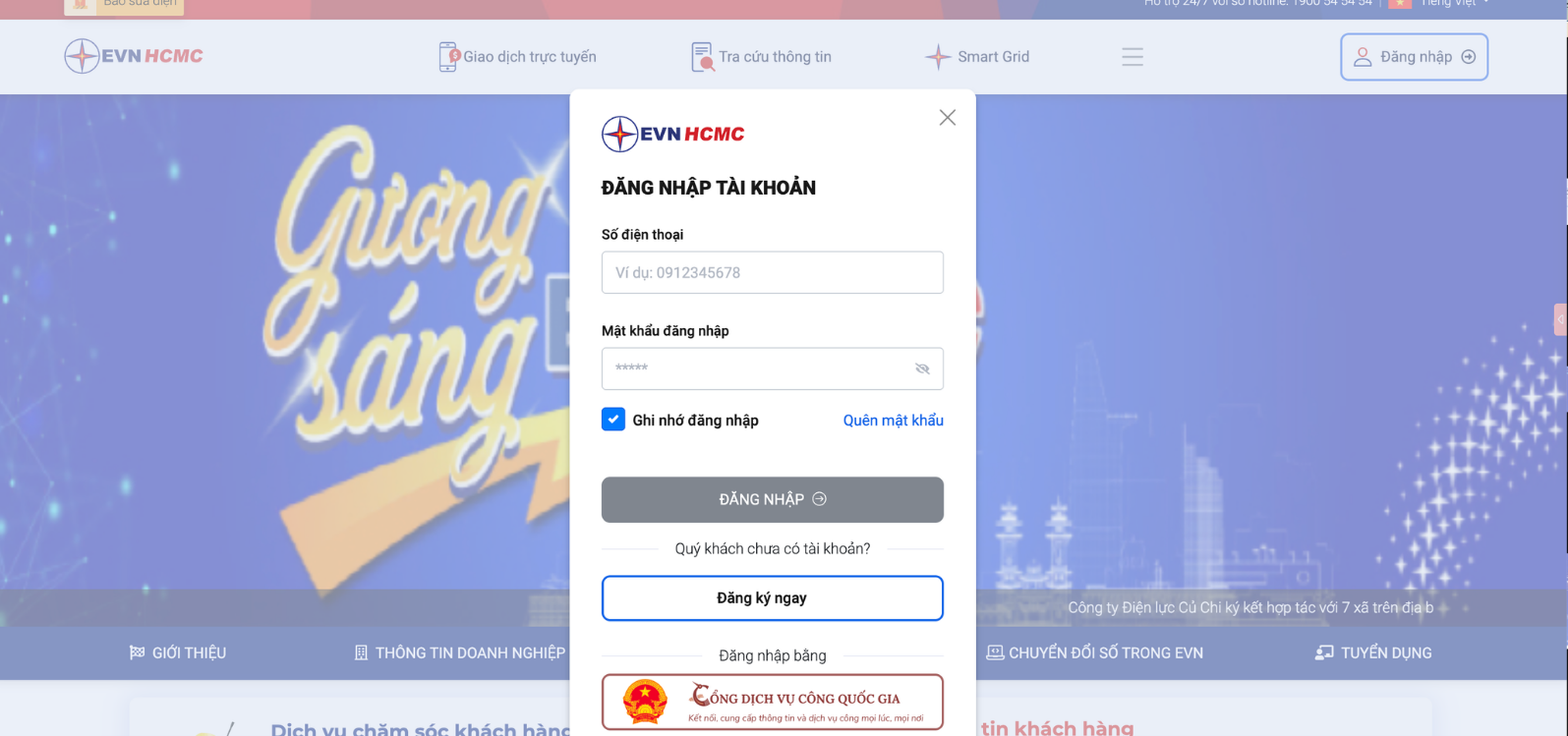 Bước 1: Truy cập Website EVNHCMC tại địa chỉ https://cskh.evnhcmc.vn. và Đăng nhập