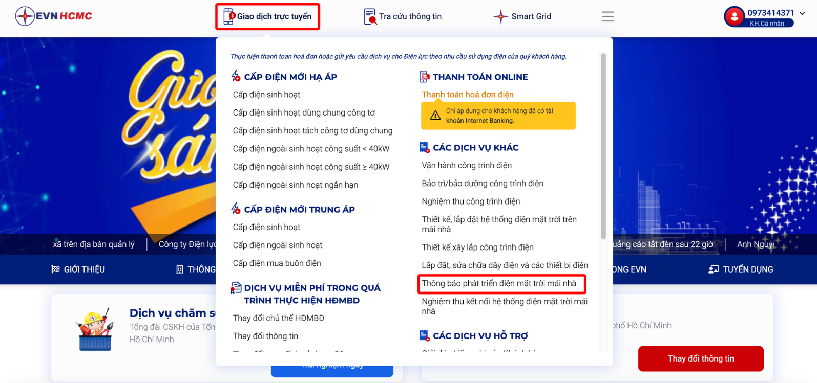 Bước 2: Sau khi đăng nhập thành công -> Chọn mục “Giao dịch trực tuyến” -> Truy cập “Các dịch vụ khác” -> Chọn “Thông báo phát triển điện mặt trời mái nhà”