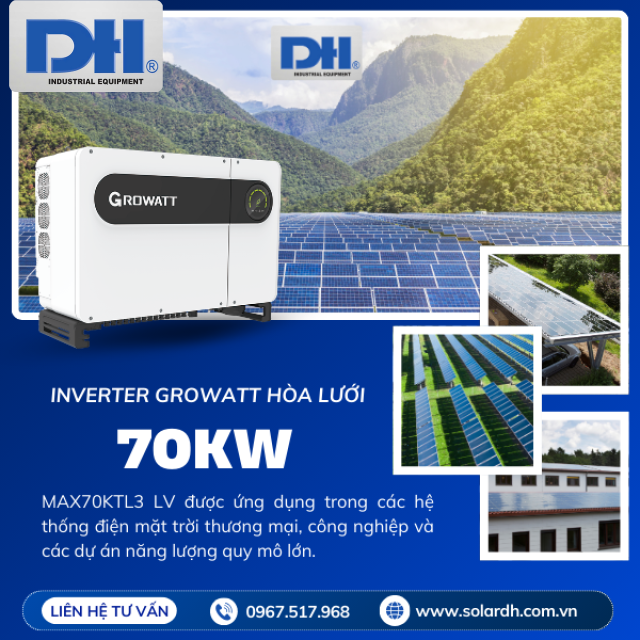 Inverter Growatt 70kW Model MAX70KTL3 LV, mang lại hiệu suất vượt trội đến 99% cho hệ thống điện mặt trời của bạn. Sản phẩm thiết kế 7 MPPT độc lập, khả năng giám sát từ xa thông minh và trang bị nhiều tính năng an toàn. Biến tần Growatt MAX70KTL3 LV là lựa chọn lý tưởng, cho các hệ thống thương mại và công nghiệp quy mô lớn. Công ty Solar DH là đơn vị phân phối chính hãng của thương hiệu Growatt, cùng chế độ bảo hành uy tín đến 5 năm.
