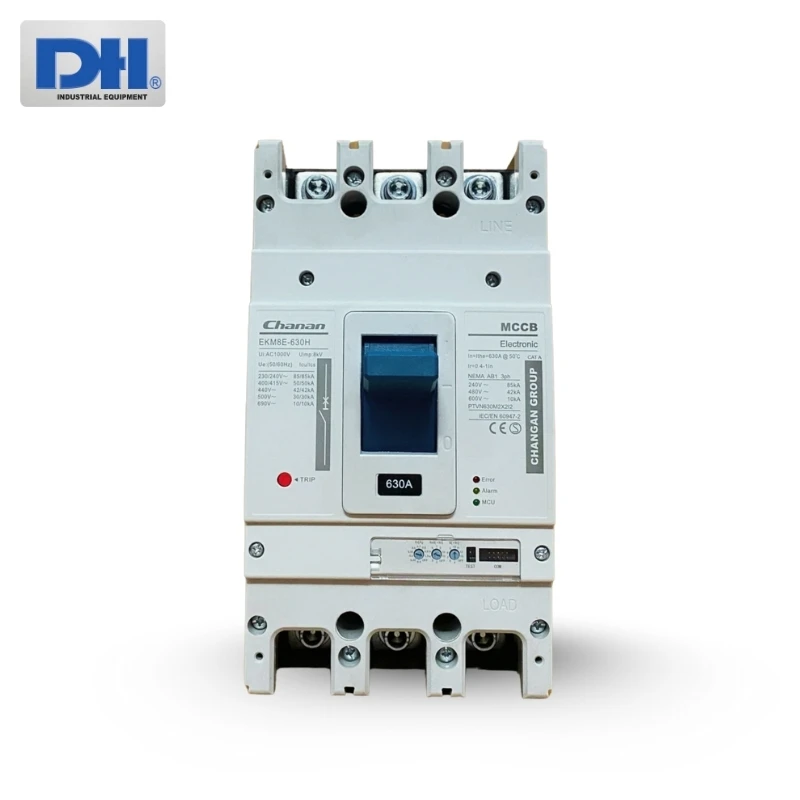 MCCB 3 pha 630A Chanan, là thiết bị đóng cắt có độ an toàn và chính xác cao. Sản phẩm chuyên dùng cho hệ thống điện công nghiệp, hoặc tủ điện năng lượng mặt trời công suất lớn. Aptomat khối 630A EKM8E-630H có dòng cắt ngắn mạch đến 42kA (480V~), trang bị cổng kiểm tra và giao tiếp cùng đèn báo hiệu tiện dụng. Hiện nay, sản phẩm được Solar DH phân phối chính hãng tại Việt Nam, đảm bảo khả năng bảo vệ vượt trội và chất lượng đạt chuẩn quốc tế.