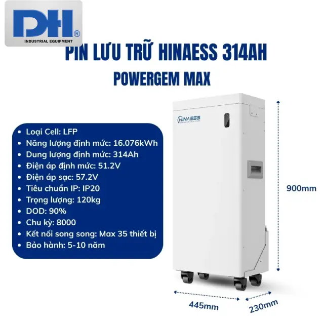 Pin lưu trữ điện mặt trời Hinaess 314Ah, là lựa chọn lý tưởng cho các hộ gia đình, doanh nghiệp và công trình quy mô vừa và lớn. Với dung lượng 16kWh, công nghệ Lithium Iron Phosphate (LFP) chống cháy nổ tốt và tuổi thọ đến 8000 chu kỳ. Sản phẩm được Solar DH phân phối chính hãng tại Việt Nam, cùng chế độ bảo hành 5-10 năm uy tín.