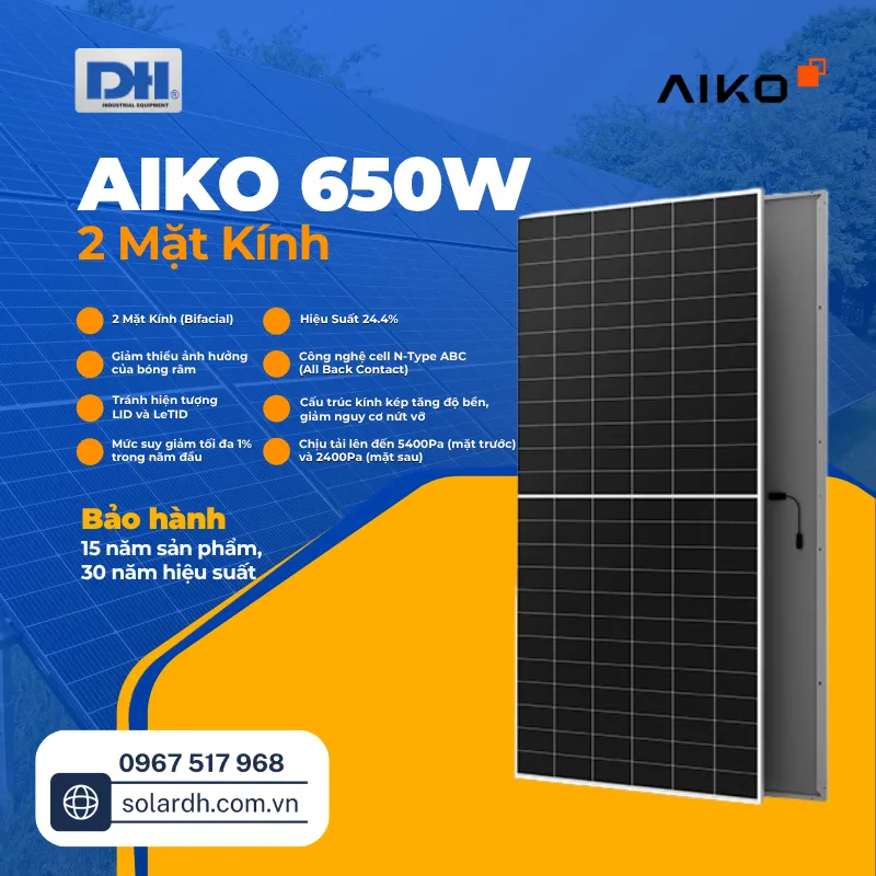 Solar DH - Đơn Vị Cung Cấp Tấm Pin Năng Lượng Mặt Trời Aiko 650W 2 Mặt Kính Uy Tín Nhất Hiện Nay